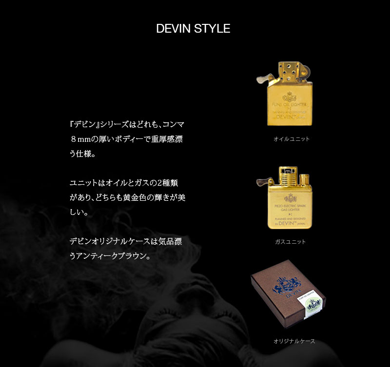 『DEVIN』は日本の伝統的な金属の表面加工技術と職人技を最大限に駆使し、 抜群の機能性を美しいフォルムに閉じ込めたクオリティーコンシャスなライターを創造。 妥協なき品質と気鋭のデザイナーが生み出す造形美で、 唯一炎を扱うことのできる人類の根源的な道具へ挑戦する…。 DEVIN (デヴィン)の語源は“詩人”、ゲール語では“悪党”を意味する。 秩序を乱すものへの憧れと芸術性をコンセプトに ワイルドかつラグジュアリーな 究極のアイテムへ躍動する。。 黄金のオイルユニットとガスユニットが使用でき、刻印される気高いスカル紋が象徴。
